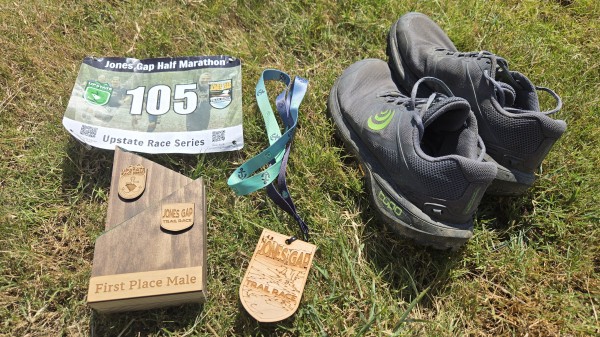 This was my first Jones Gap Trail Race, which is usually a half marathon in name but sometimes the distance is "close to" a half marathon. With some of the trails in Jones Gap State Park still closed after Hurricane Helene, this year's race course was a little over 12 miles (by my GPS). We ran on the road about 2 miles going into the park, then again on the return. The course had two large climbs... the first was up to Rainbow Falls and is the steeper of the two. The second was up Jones Gap Trail past two more waterfalls -- Jones Gap Falls and Toll Road Falls.