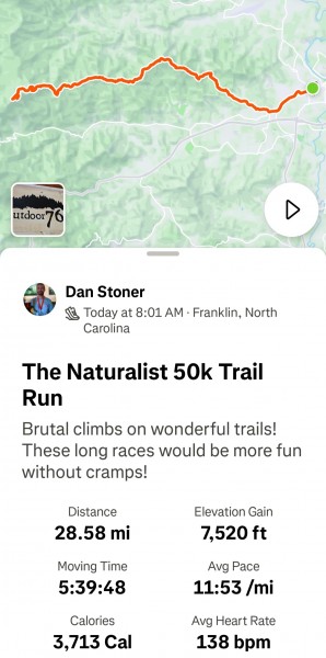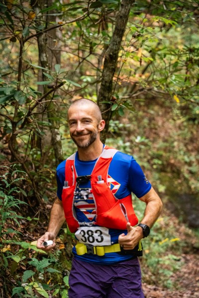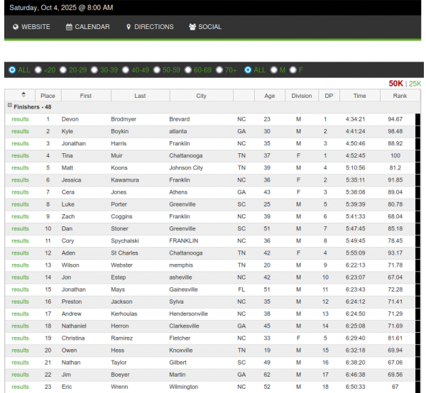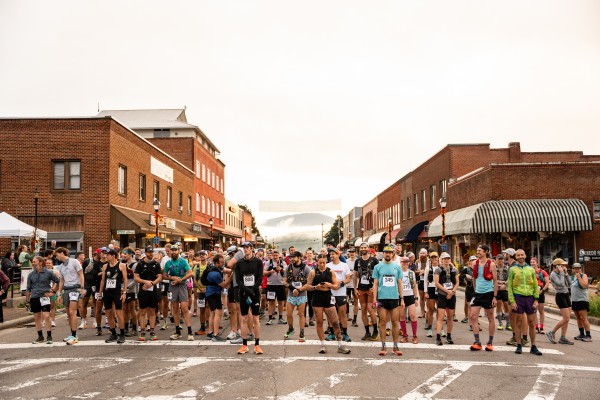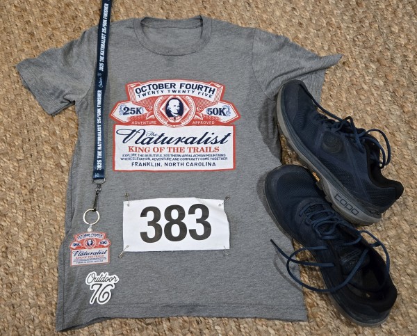 The shorter 25k race finishes on the top of Wayah Bald. The 50k runners turn around and run all the way back to town.