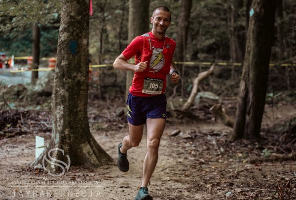 The weather was great on a beautiful cool morning. The race started and Neil Winter shot off the starting line like he was running a 5k. I got out smooth and quick but settled into a comfortable pace for this distance and knowing the climbs that were coming. Neil was long gone by the time we got to the state park entrance. When I stepped off the pavement onto the first bit of trail inside the state park, I was in 4th place.